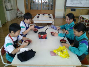 味噌汁を作ろう(4年生) 2026年2月20日 福光南部小学校 4年生 3年生のときになのはなで作った味噌が1年間の熟成期間を経て仕上がりました。その味噌を使って、味噌汁を作りました。具材を自分たちで決めて、協力して作りました。子供たちは、「おいしい!」「家でも食べたい!」と嬉しそうに味わっていました。