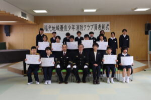 福光地域優良少年消防クラブ員表彰式 2026年3月9日 福光南部小学校 ≪お知らせ≫ 福光地域優良少年消防クラブ員表彰式を行いました。 広瀬舘地区の6学生が6年間、自分の地区の防火を呼びかけた功績が認められ、地区の消防団長より表彰されました。 児童代表がお礼の言葉を述べ、卒業しても地域を火災から守ろうとする気持ちがさらに高まりました。