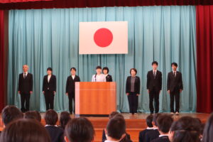 始業式後、生徒指導主事より、一人一人が自分で考えて、「お話すること」「決定すること」「行動すること」から、「わくわくする学校」をつくっていこうという話がありました。