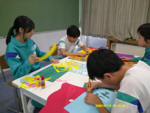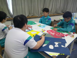 紙が奏でる形と色のハーモニー(5・6年生) 2026年4月15日 福光南部小学校 5年生, 6年生 5・6年生合同で図画工作科を行っています。 今日の学習では、カッターをうまく使いながら色画用紙や色紙を切り抜き、「この色とこの色が合うね」「この形面白い!」と学年関係なく声をかけ合いながら、楽しく作品を作りました。学習参観に展示しますので、ぜひご覧ください。