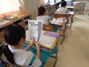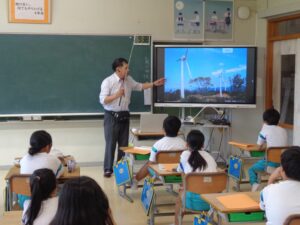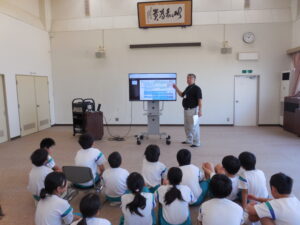 4年生は、富山県生活環境文化部環境政策課と(公財)とやま環境財団のご支援を受けて「とやま環境未来チャレンジ」に取り組んできました。夏休みの間、地球温暖化防止の取り組みを家族と協力しながら行ってきました。今日は、杉森推進委員をお招きして「環境チャレンジ教室」を開き、自分たちの取り組みを振り返ったり、社会全体でできる取り組みについて考えたりしました。