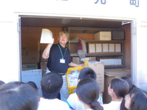 物流センターには、大きなトラックがたくさん停まっていました。富山県内や県外のたくさんのお店に、すばやく、新鮮に、たくさんの商品を届けるための工夫がありました。