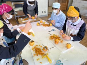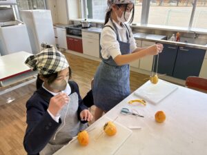 干柿づくり(6年生) 2025年11月10日 福光南部小学校 ≪お知らせ≫ 熊対策として学校敷地内の柿の木を剪定しました。枝に付いていた柿を活用して、干し柿づくりをしました。 昨年の経験を思い出し、50個以上作り、教室横に干しました。12月末に干柿ができたら、正月の飾りや料理に使いたいと考えています。