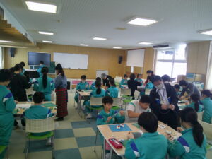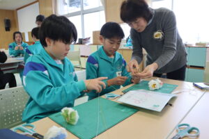 地域の講師の方7名をお招きして、6年生が卒業式に付けるコサージュを作りました。最初に中心の花を五箇山和紙で上手に作り上げると、その周りに水引やビーズで飾りをつけて完成させました。当日保護者につけていただくコサージュも作りました。