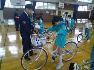 駐在所の方から自転車の点検の仕方を学び、ブレーキの利き具合やサドルの高さを点検しました。