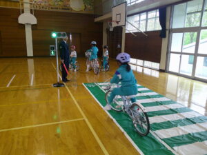 「信号が変わる前によく見て渡ろう。」「まっすぐ進むのは難しいな」と、子供たちは安全に十分気を付けながら練習することができました。